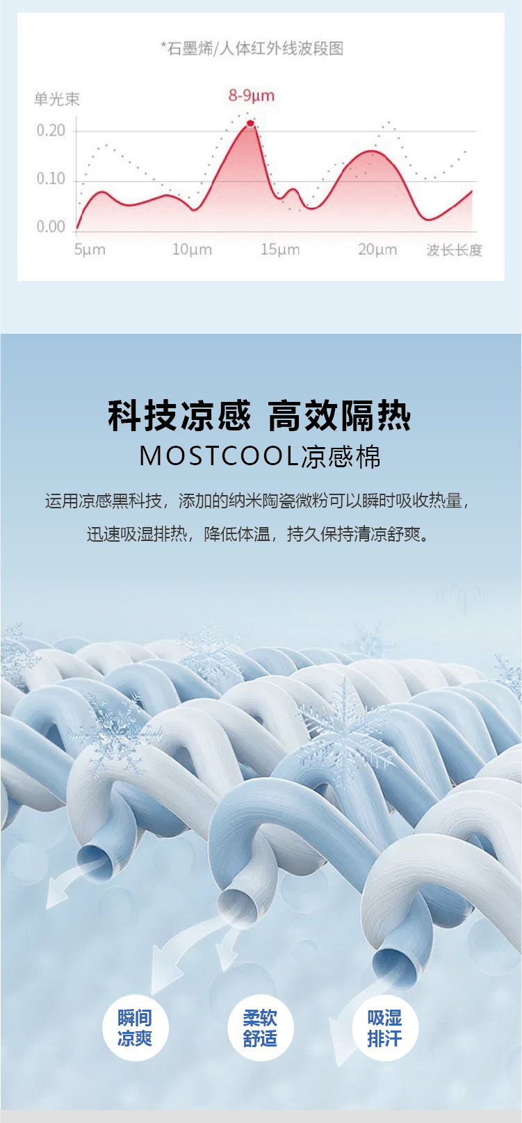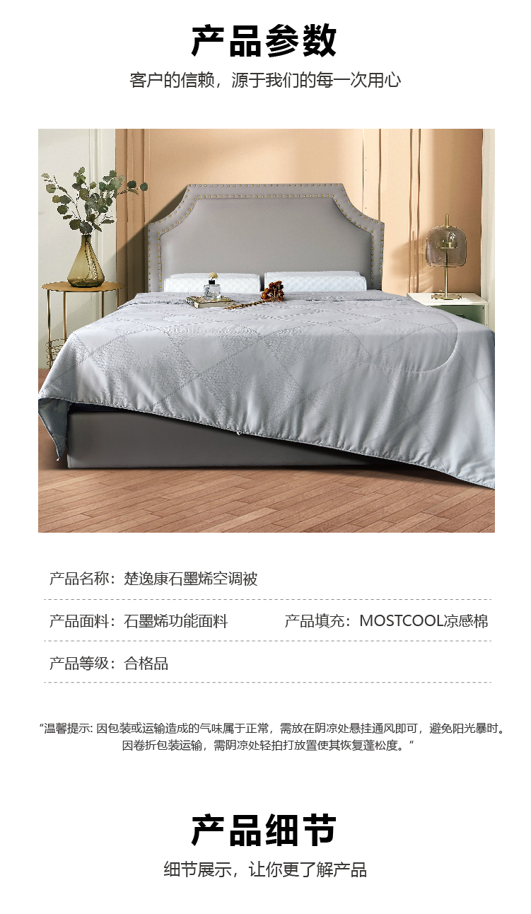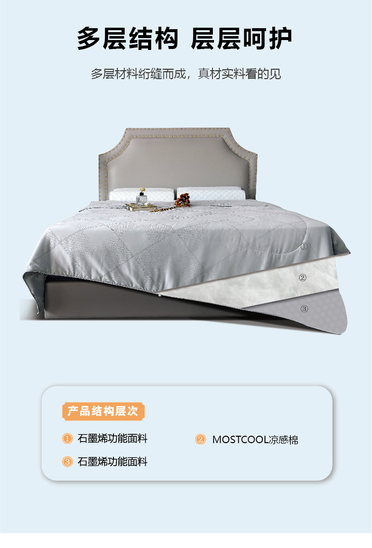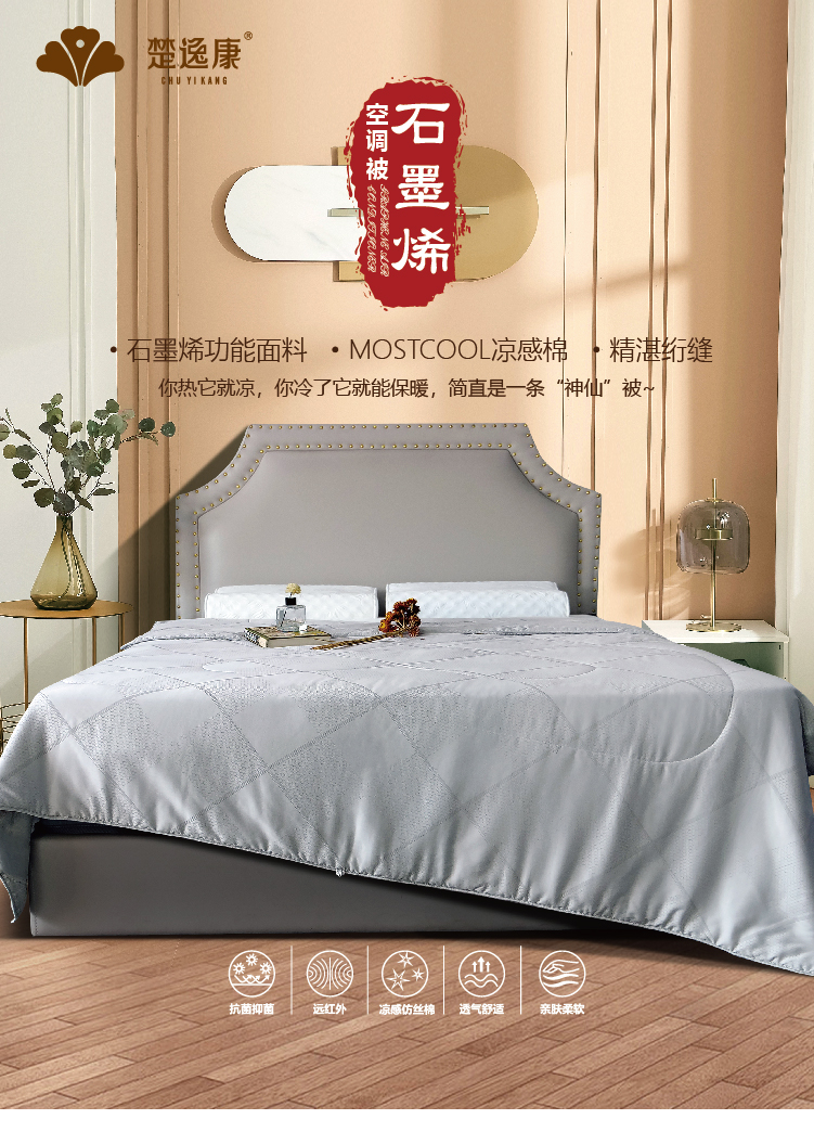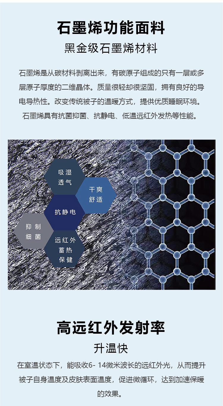 描述:石墨烯空调被一款能恒温的神奇被芯,夏季不热,冬季不凉,采用石墨烯发热及纳米陶瓷微粉吸热材料,调整睡眠温度,热的时候可以给你自动降温,冷的时候可以自动保暖,而且能发射远红外,促进微循环,不仅能让你睡得舒适,更能让你睡得健康。